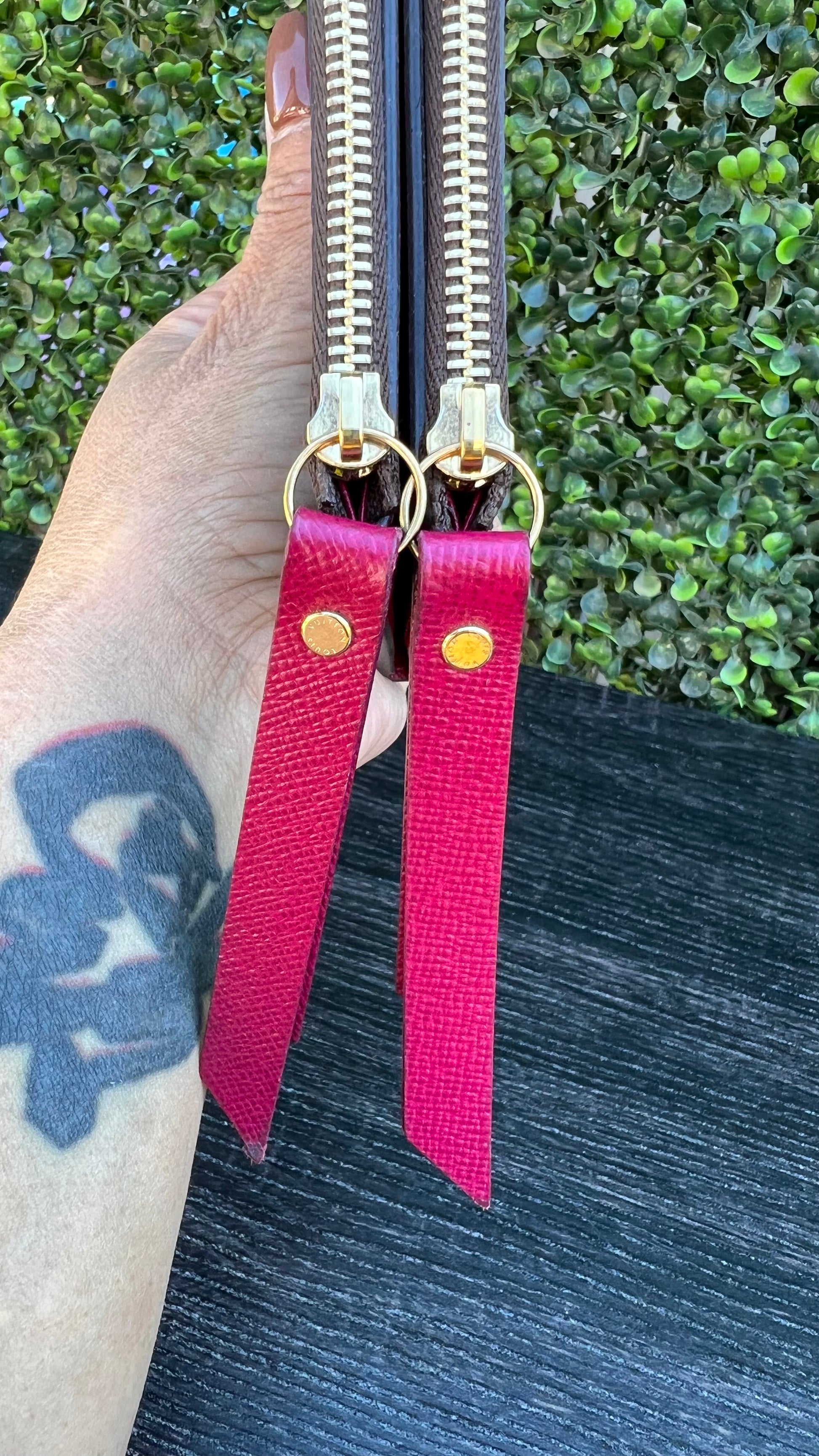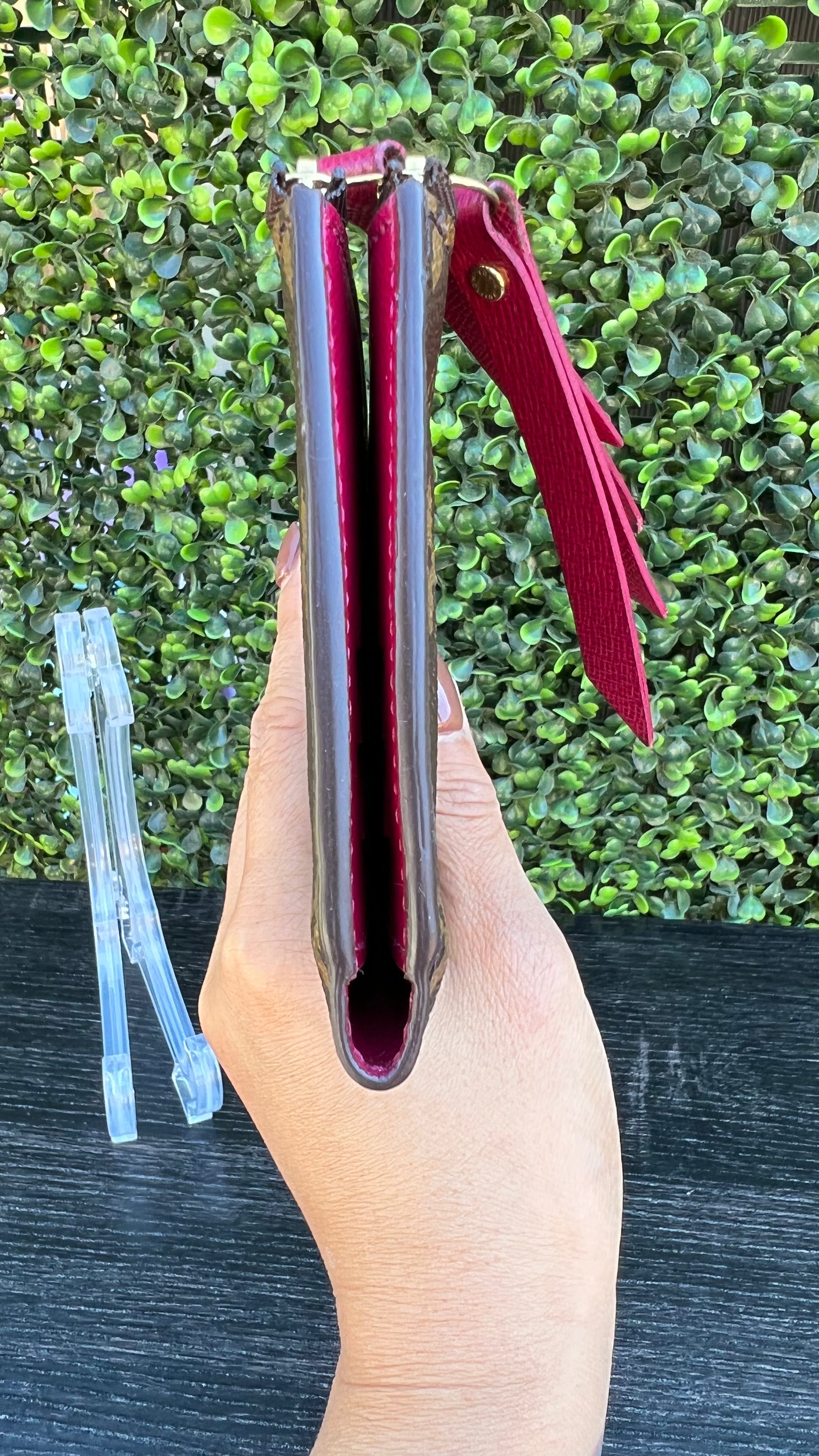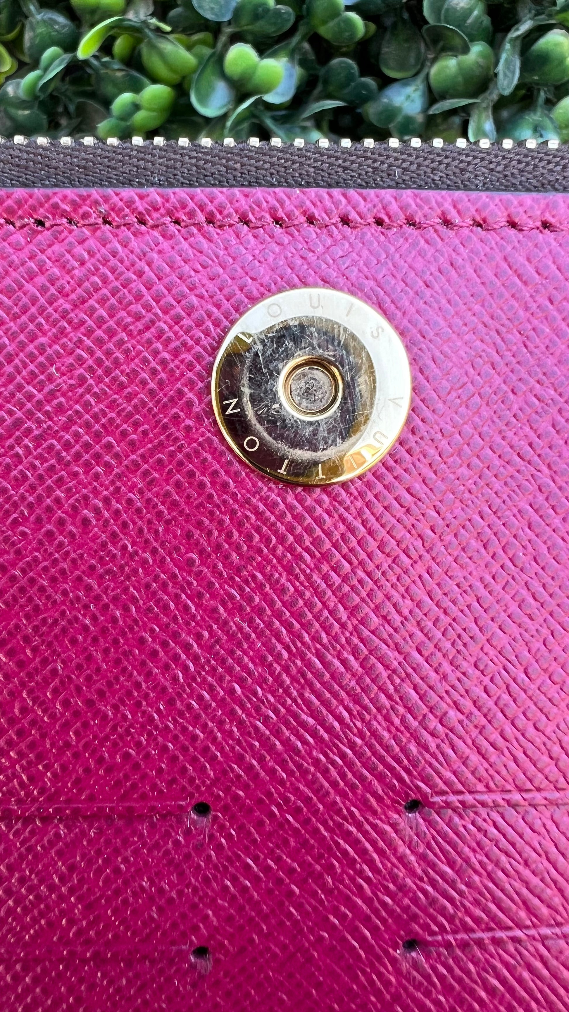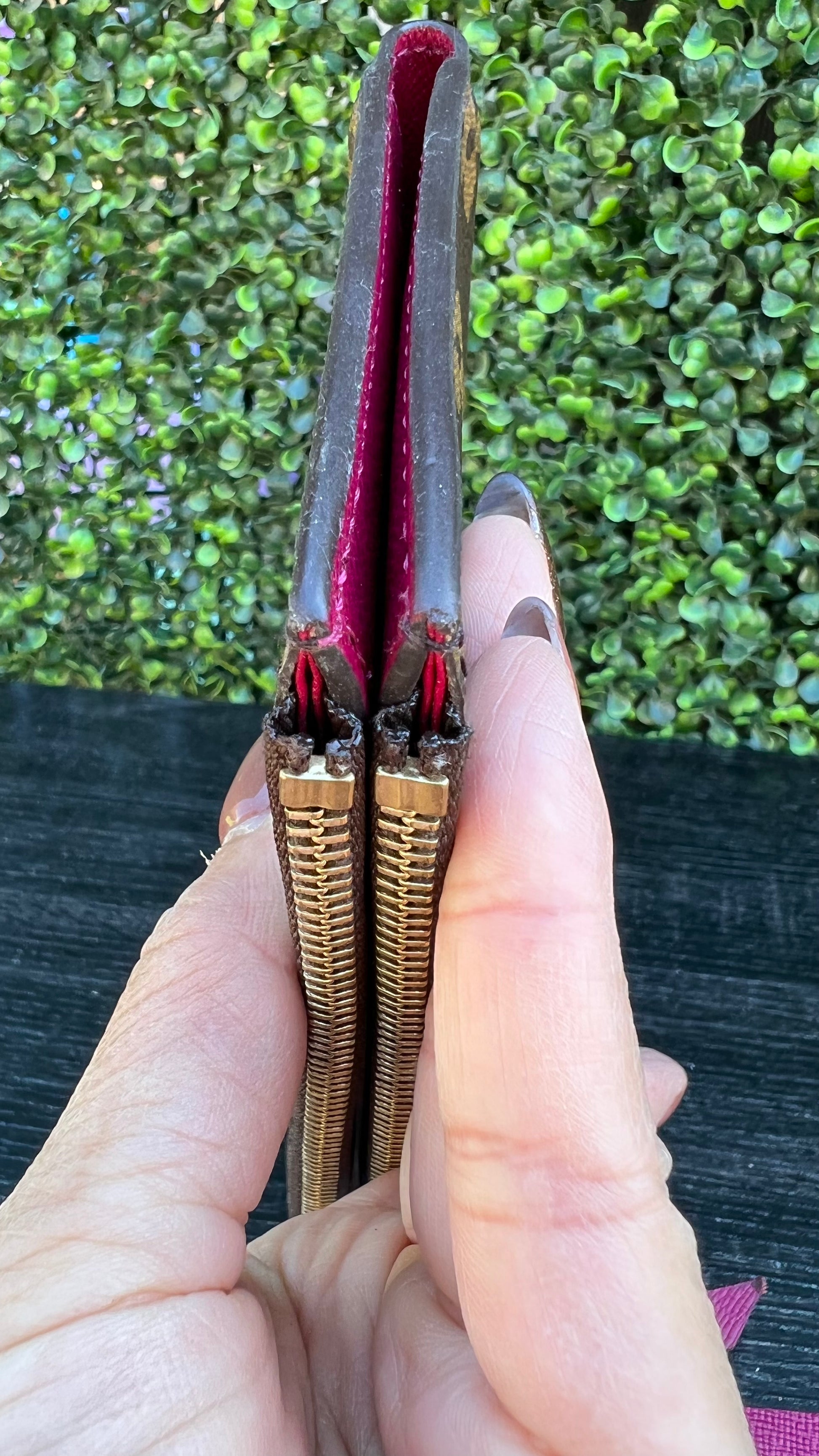 This discontinued and hard to find wallet is absolutely amazing! It has a slim and sleek profile. The wallet splits with a magnetic clasp between two zipper compartments and opens to a fuchsia cross grain leather interior. It’s large enough to carry your phone and plenty of room for cards and cash.