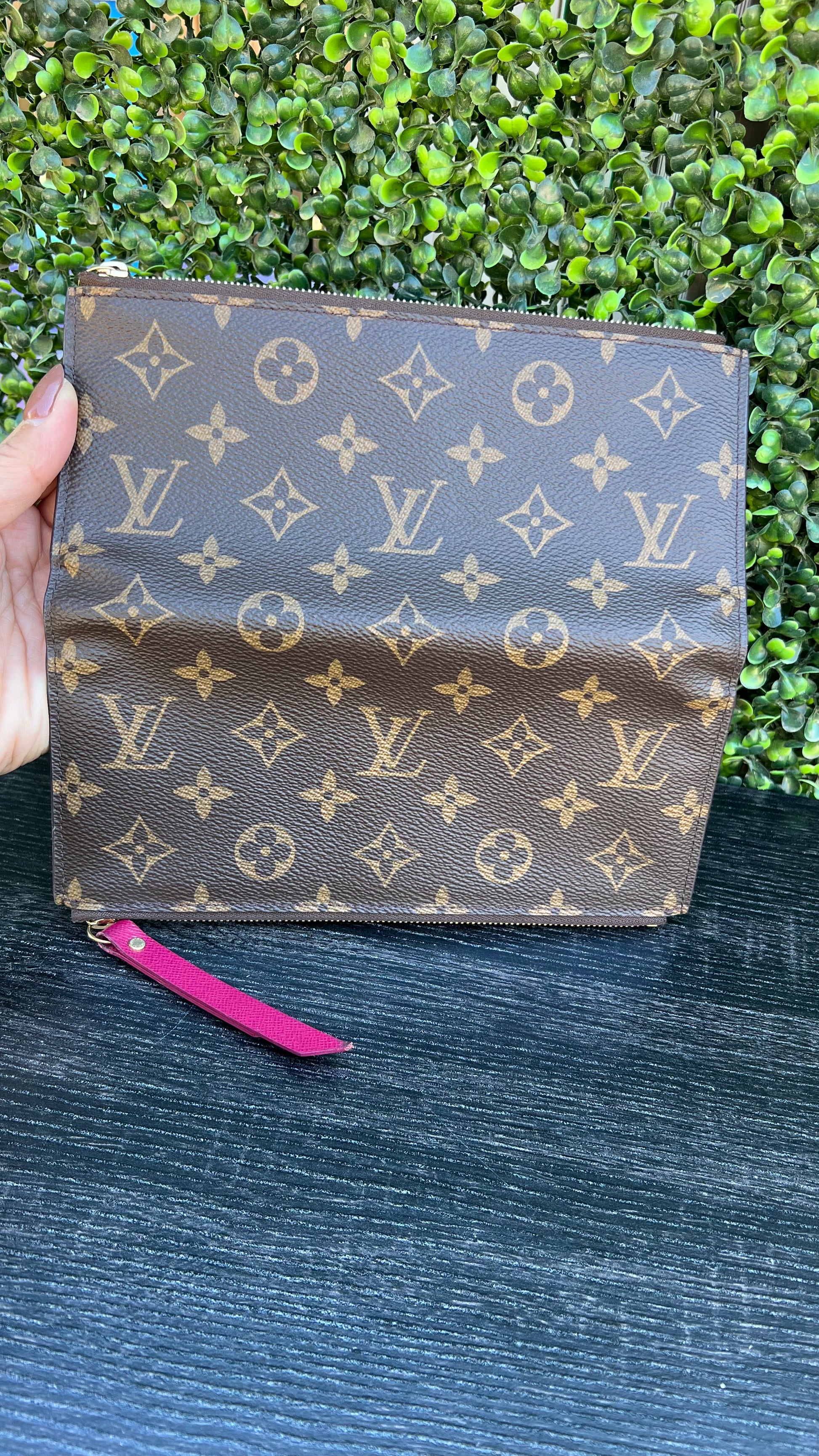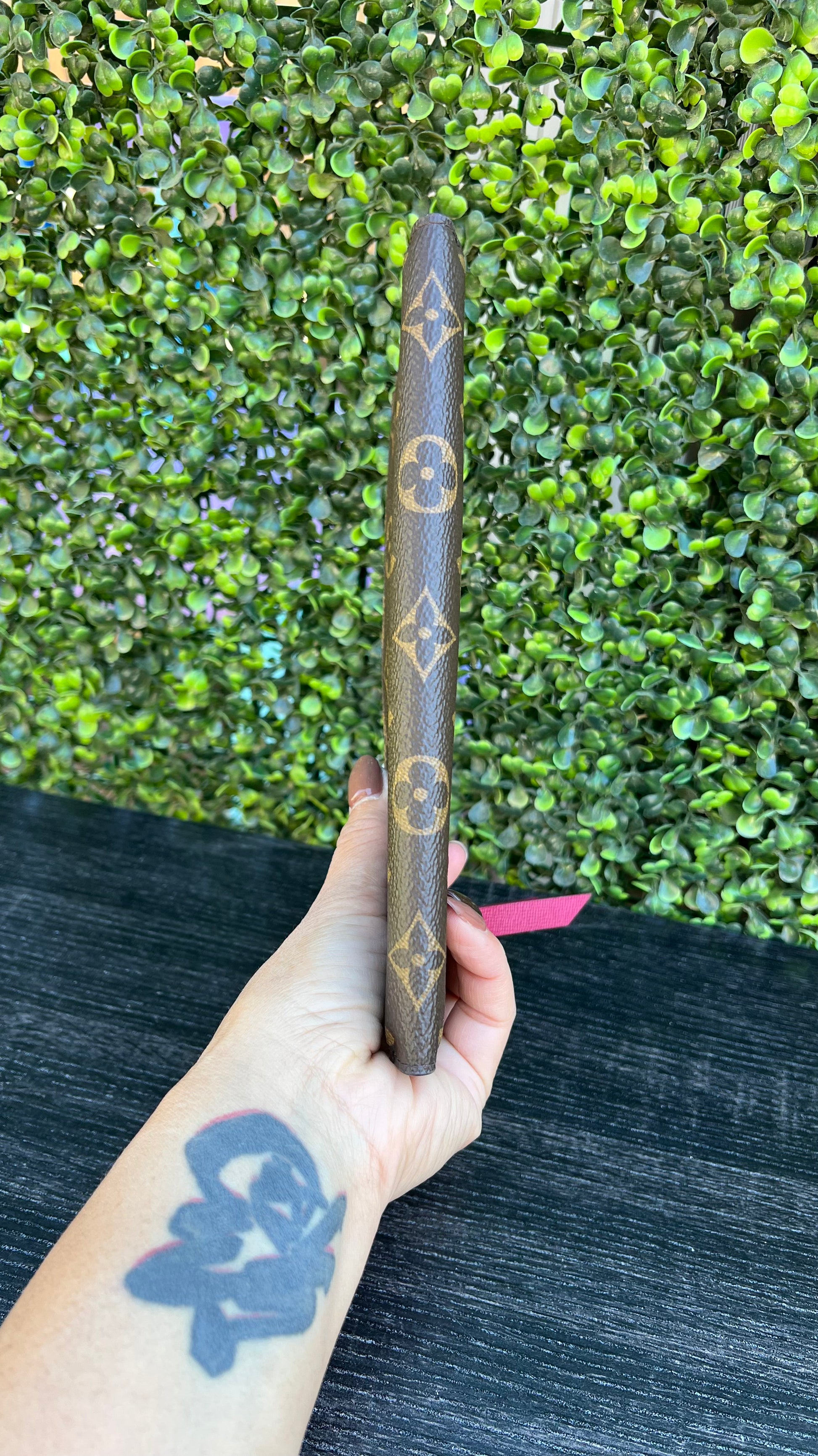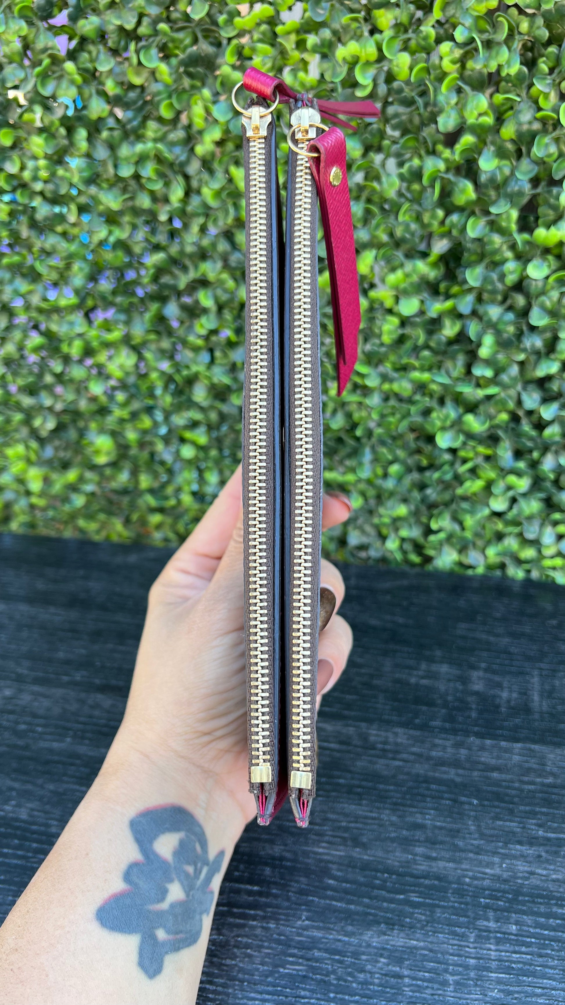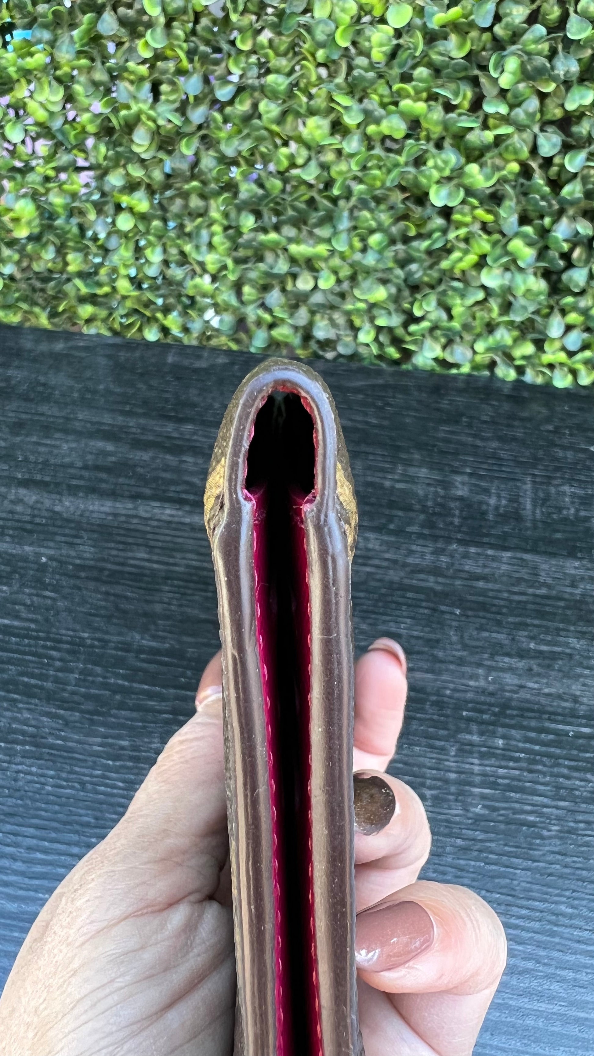 This discontinued and hard to find wallet is absolutely amazing! It has a slim and sleek profile. The wallet splits with a magnetic clasp between two zipper compartments and opens to a fuchsia cross grain leather interior. It’s large enough to carry your phone and plenty of room for cards and cash.