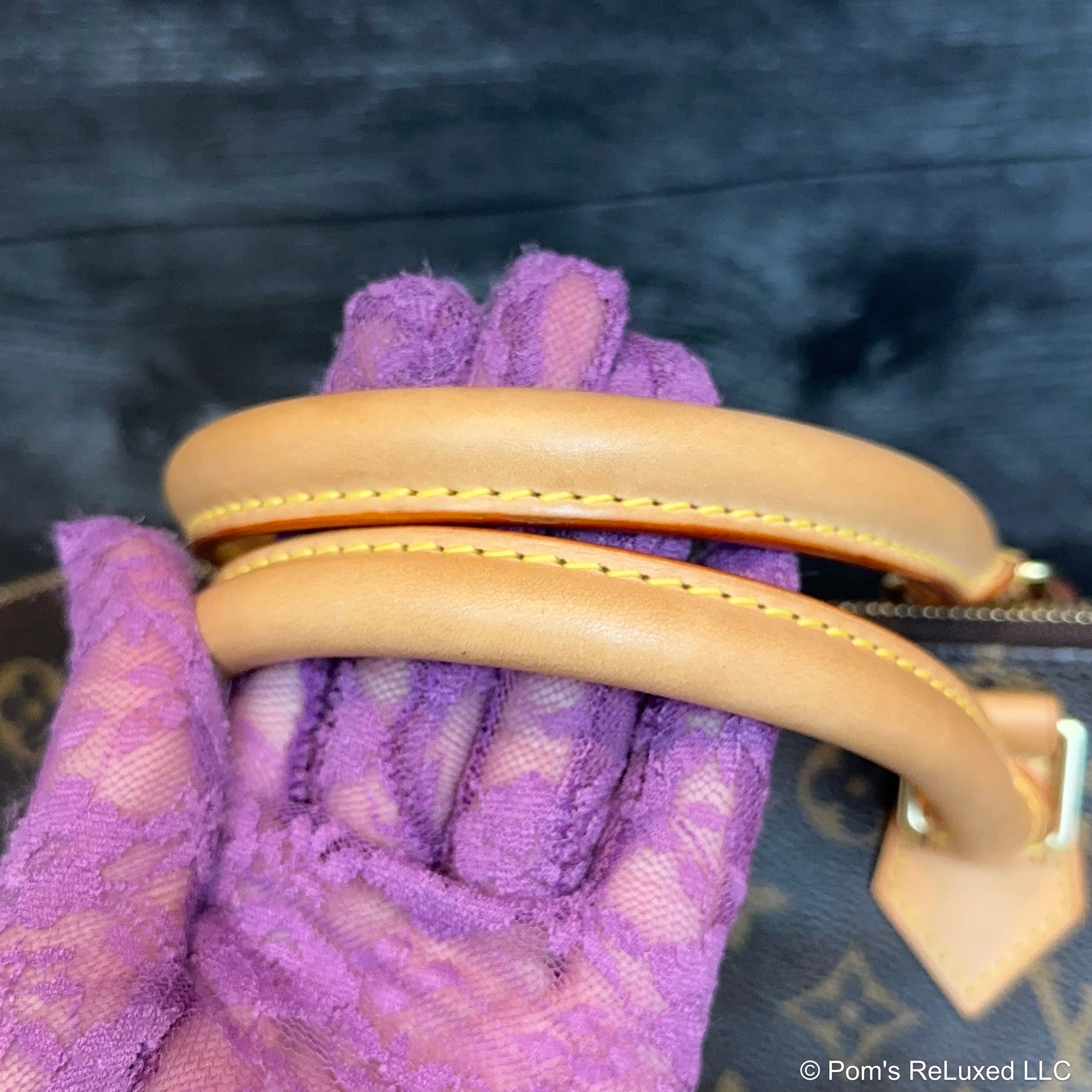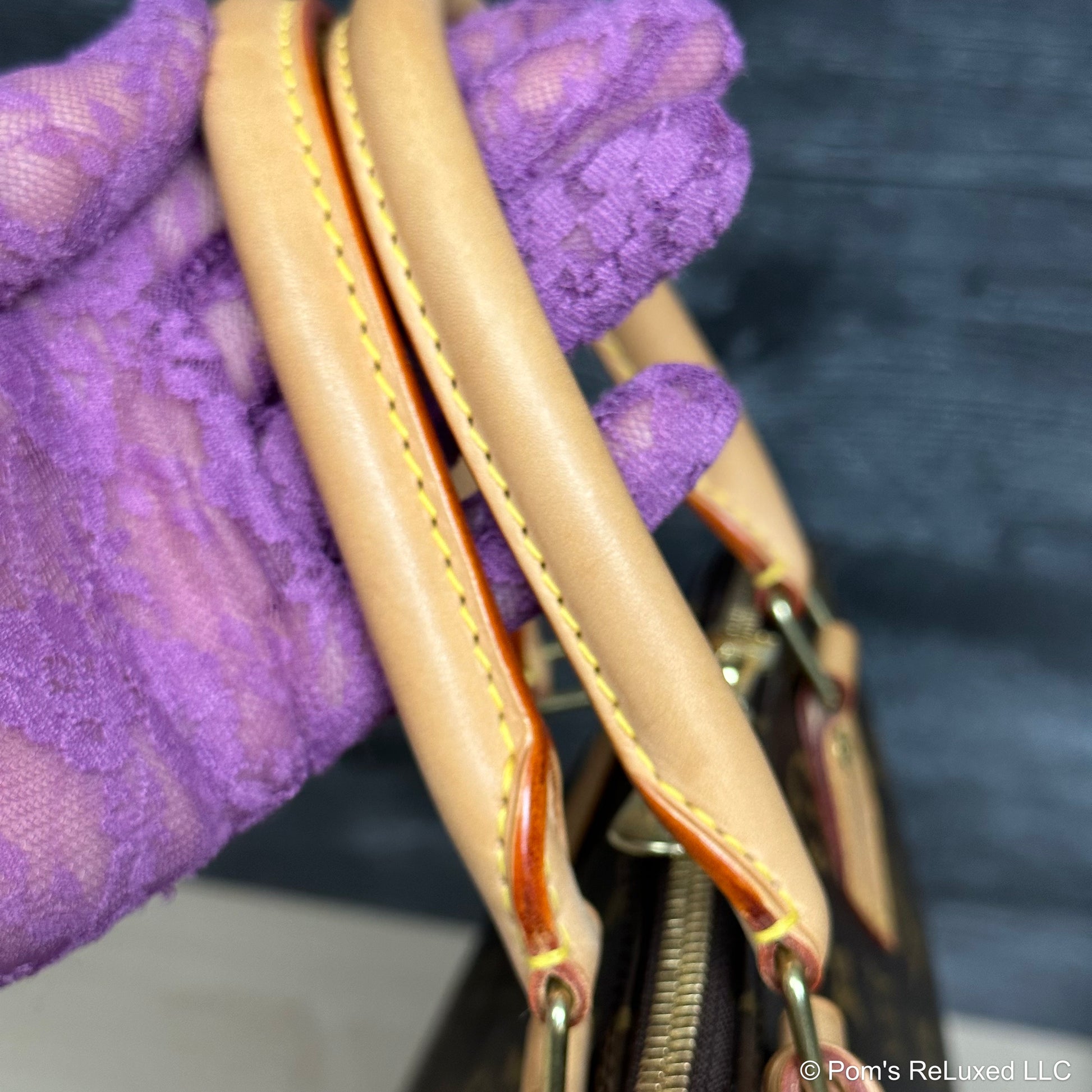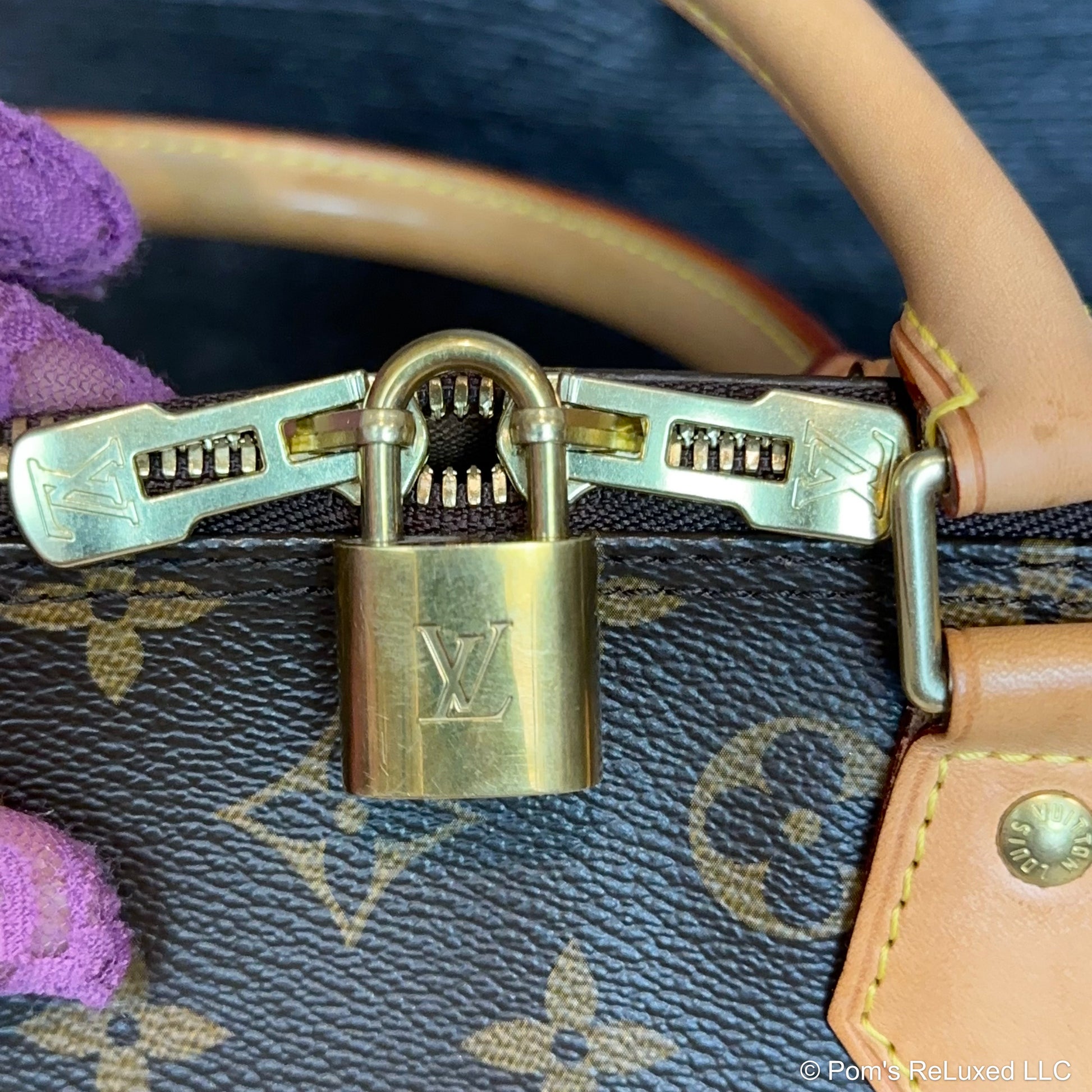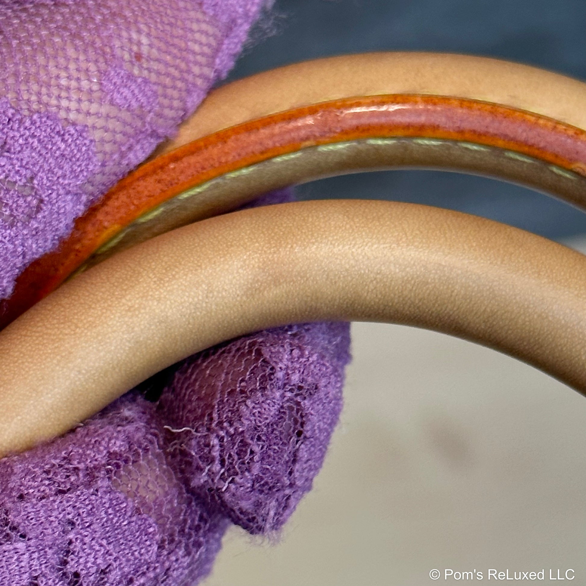 In very good preowned condition. Canvas is vibrant and beautiful. The trim and handles have developed a lovely honey patina. There's very light stains and scuffs consistent with a used bag but still look beautiful.the Hardware is bright and shiny with normal wear. Interior is clean. No odor. Comes with lock and clochette with 2 keys.