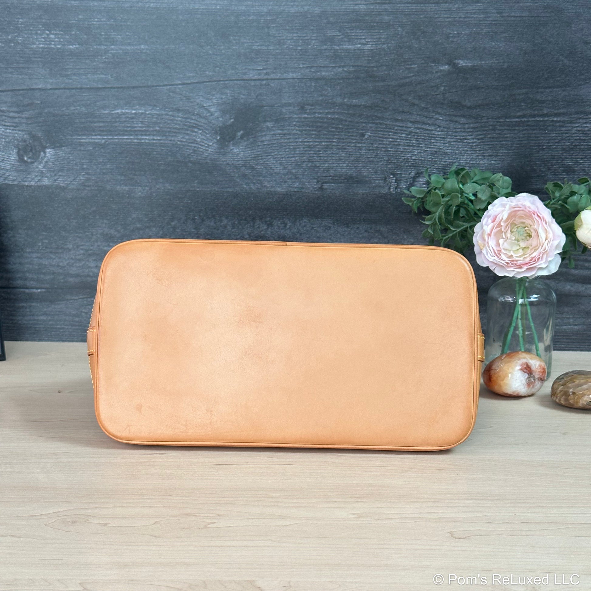 In great condition especially for being 26 years old!! The exterior canvas is beautiful, vibrant and clean. The vachetta leather is a honey patina with just minor watermarks. The base of the bag and the corners and edges has minor watermarks and wear with two smaller darker stains, please see the photos. The hardware is bright and shiny with minimal wear. The inside is clean and there is no smell. The handles and tabs are sturdy and in great condition. Zippers run smoothly. There are D rings on the handles that you can add a longer strap for crossbody carry.