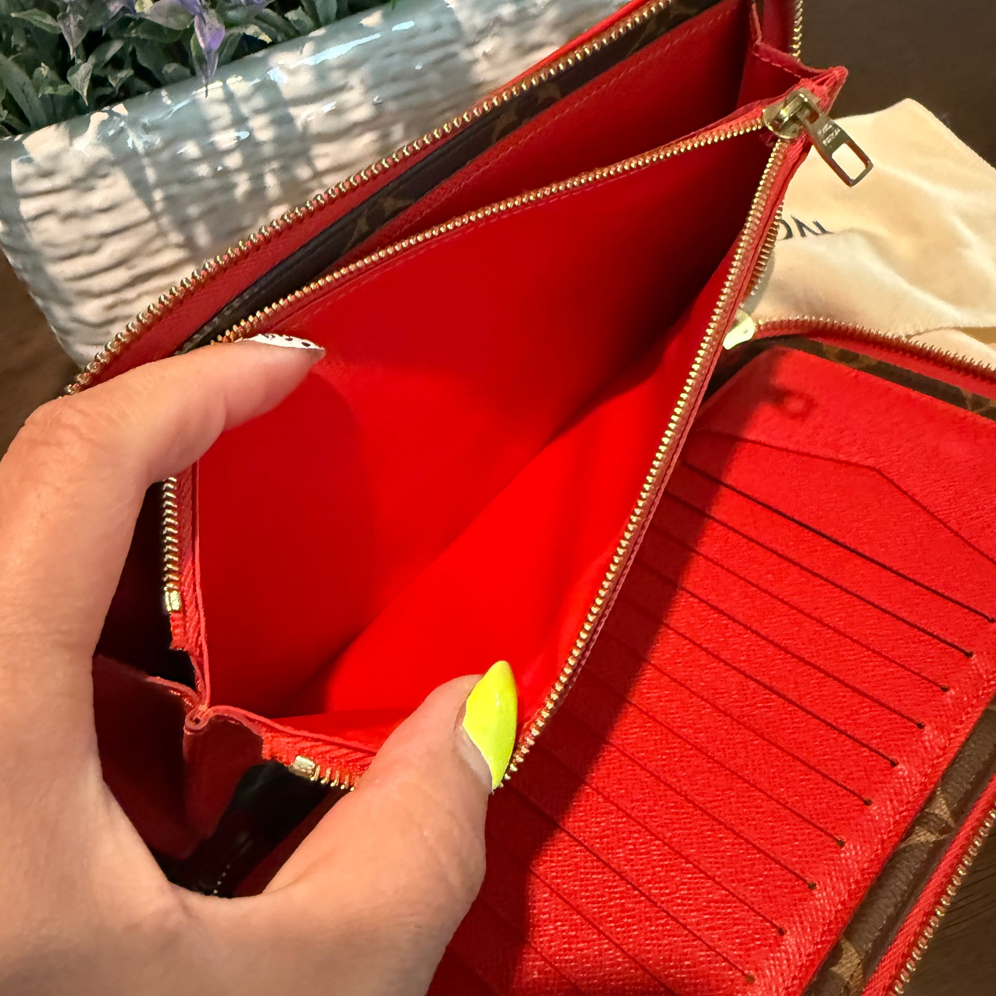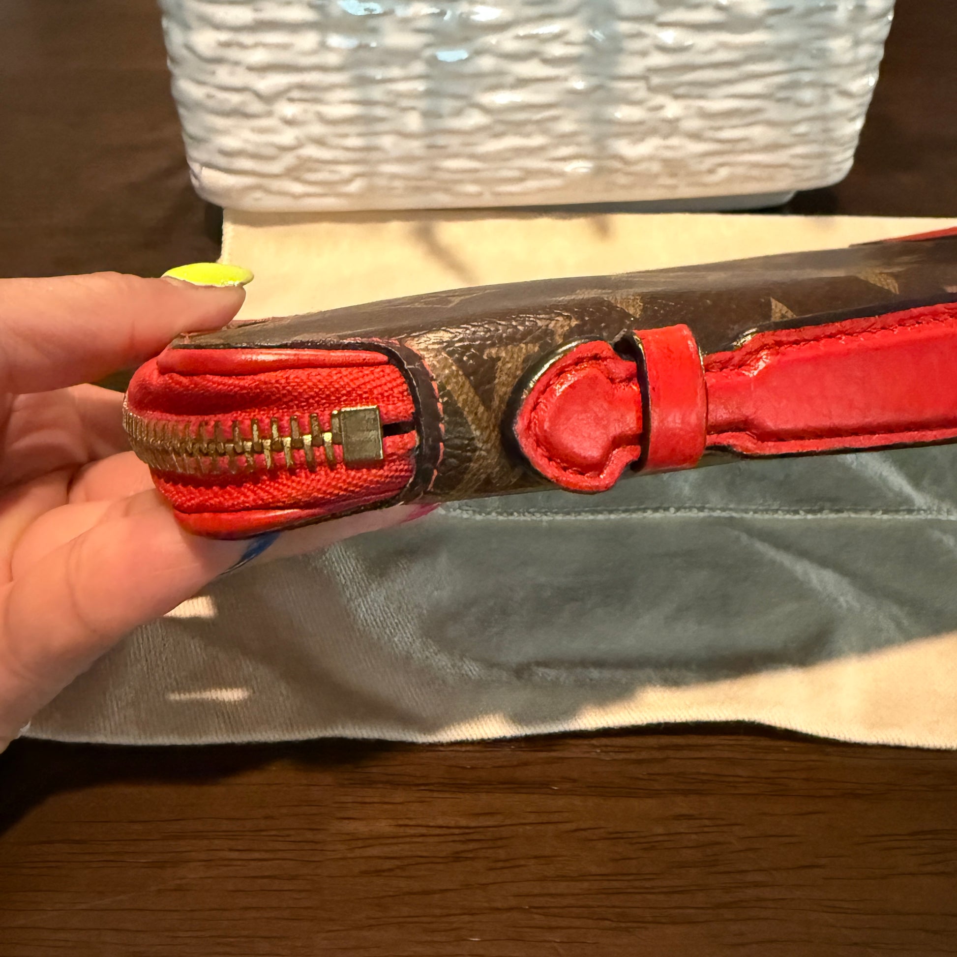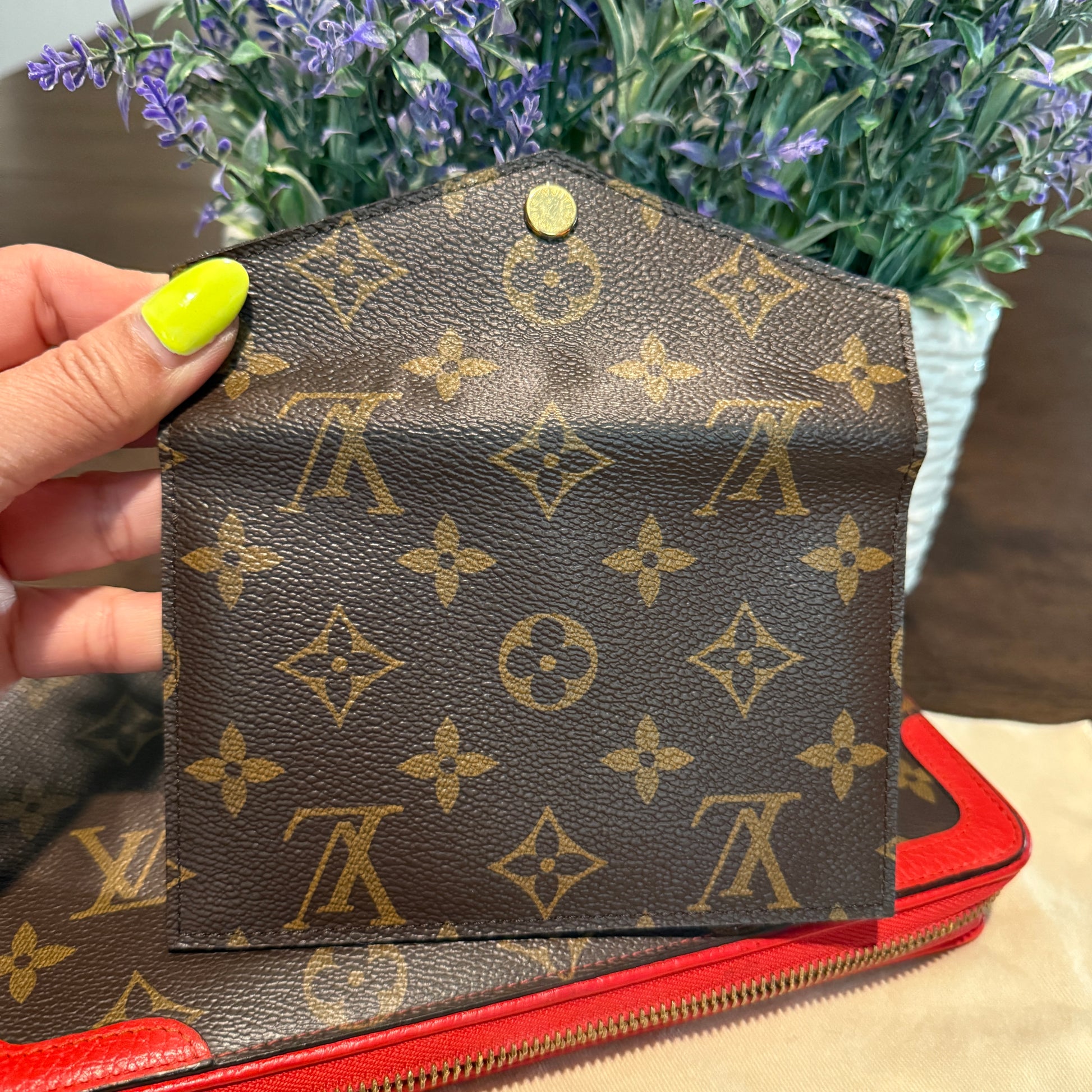 Discontinued and rare, this clutch is perfect for daily and travel essentials. Featuring gold-tone hardware, red leather trim, corner reinforcements, and a top handle for clutch use. The wrap-around zipper reveals multiple card slots, a bill pocket, a zipper compartment, and a removable wallet. Ideal for those who value top-notch organization. Don't miss out!