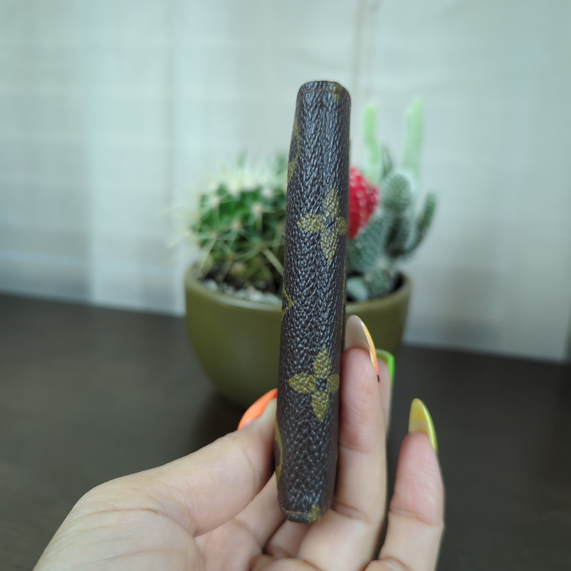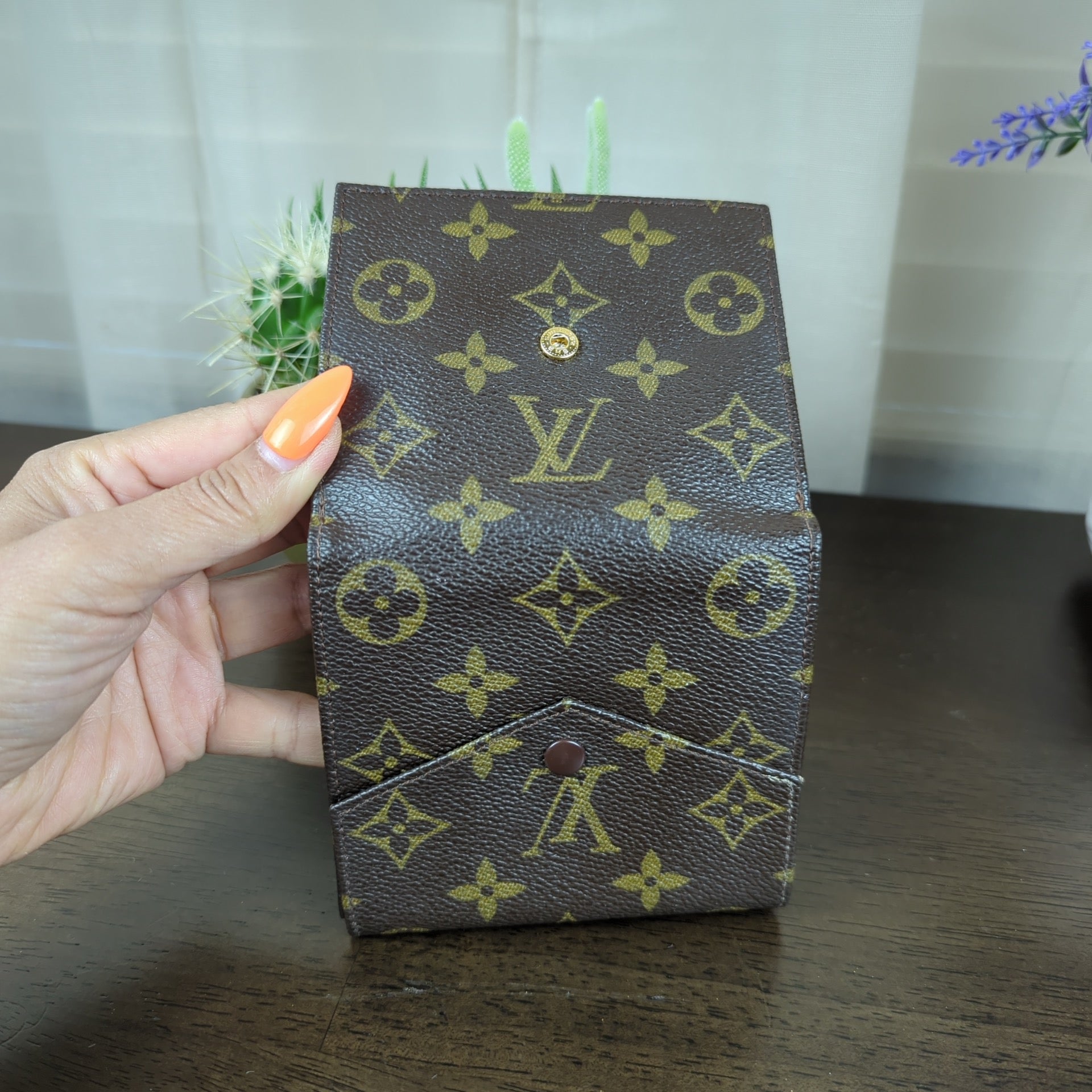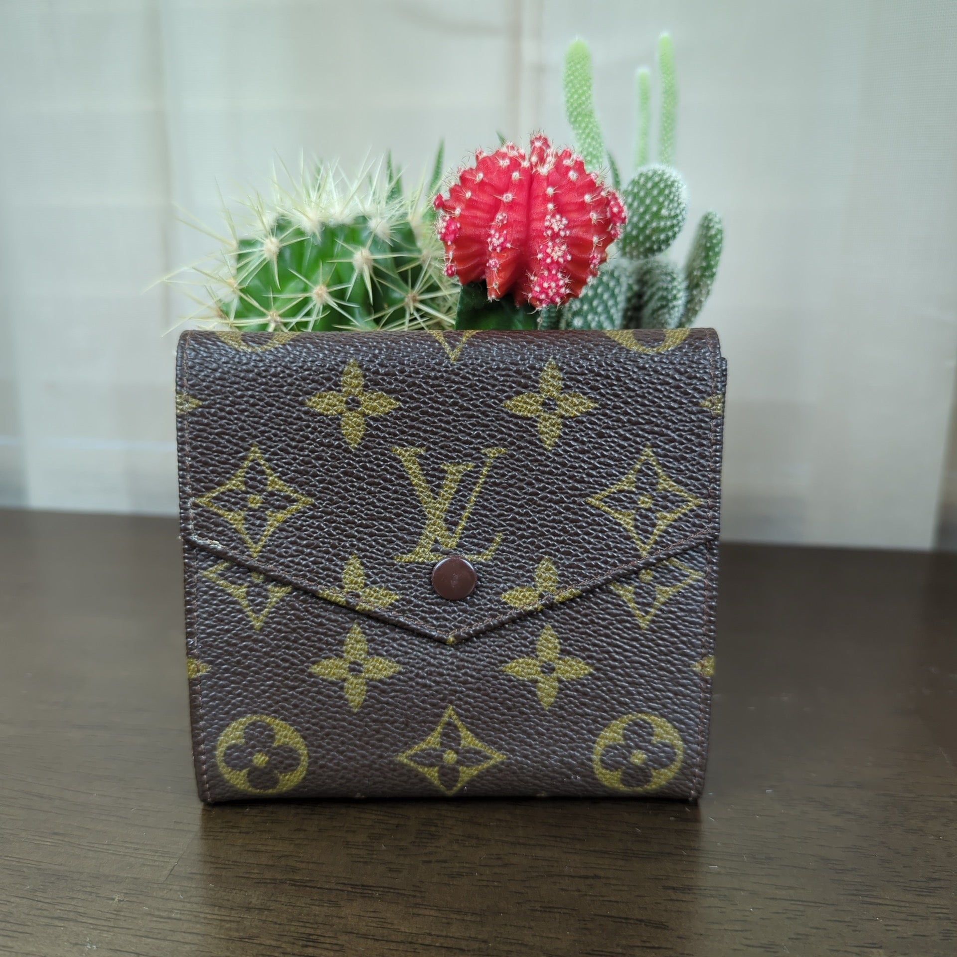 Timeless elegance in a compact size. This vintage tri-fold wallet features a durable coated canvas exterior with a rich brown cross-grain leather interior. Made in France (Date Code: 871AN), it offers classic styling and practical functionality with: